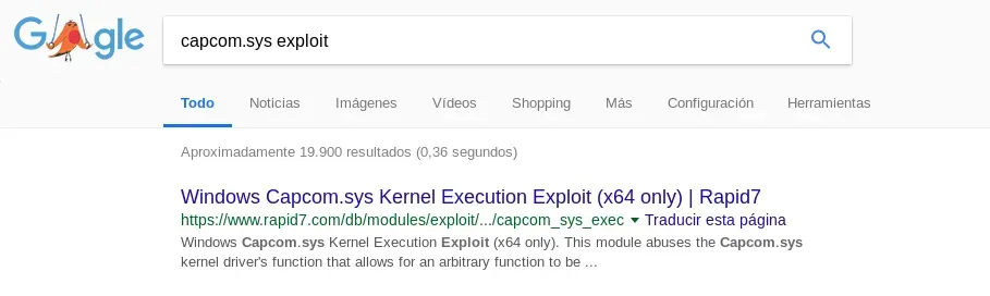 Reviewing the files in the C:\Windows directory, I noticed the file capcom.sys and with a simple search I saw that it could be useful to scale to system: