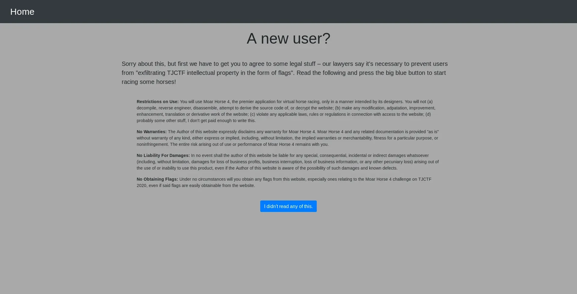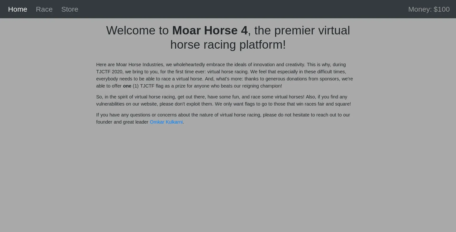 Para la demostración de esta vulnerabilidad vamos a usar un reto web del ctf TJCTF 2020: Moar Horse 4.