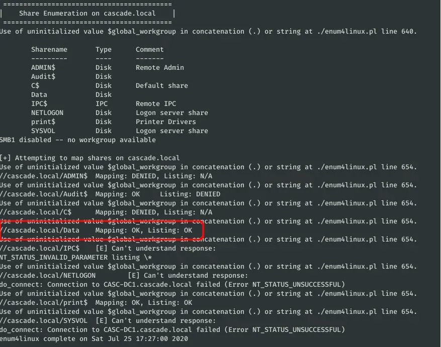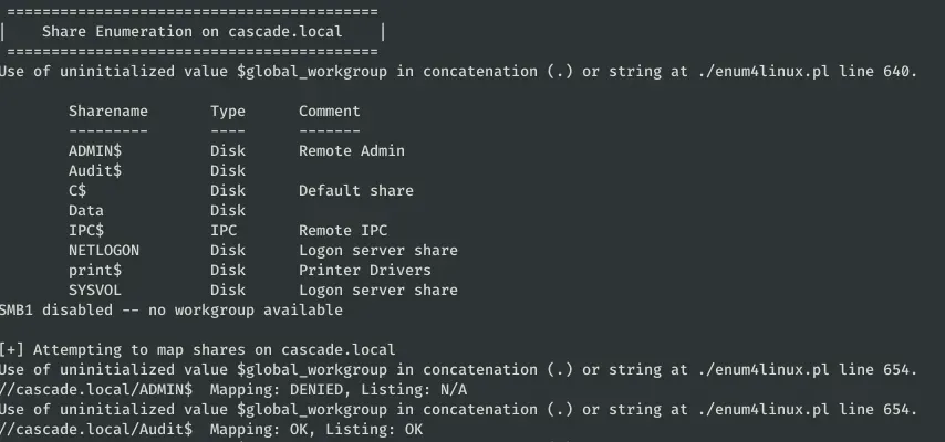 enum4linux -u s.smith -p sT333ve2 -S cascade.local