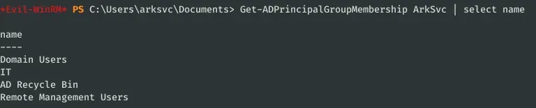 Accedemos con Evil-WinRM al servidor con las credenciales ArkSvc:w3lc0meFr31nd. Vamos a enumerar con este nuevo usuario, listamos los grupos a los que pertenece: