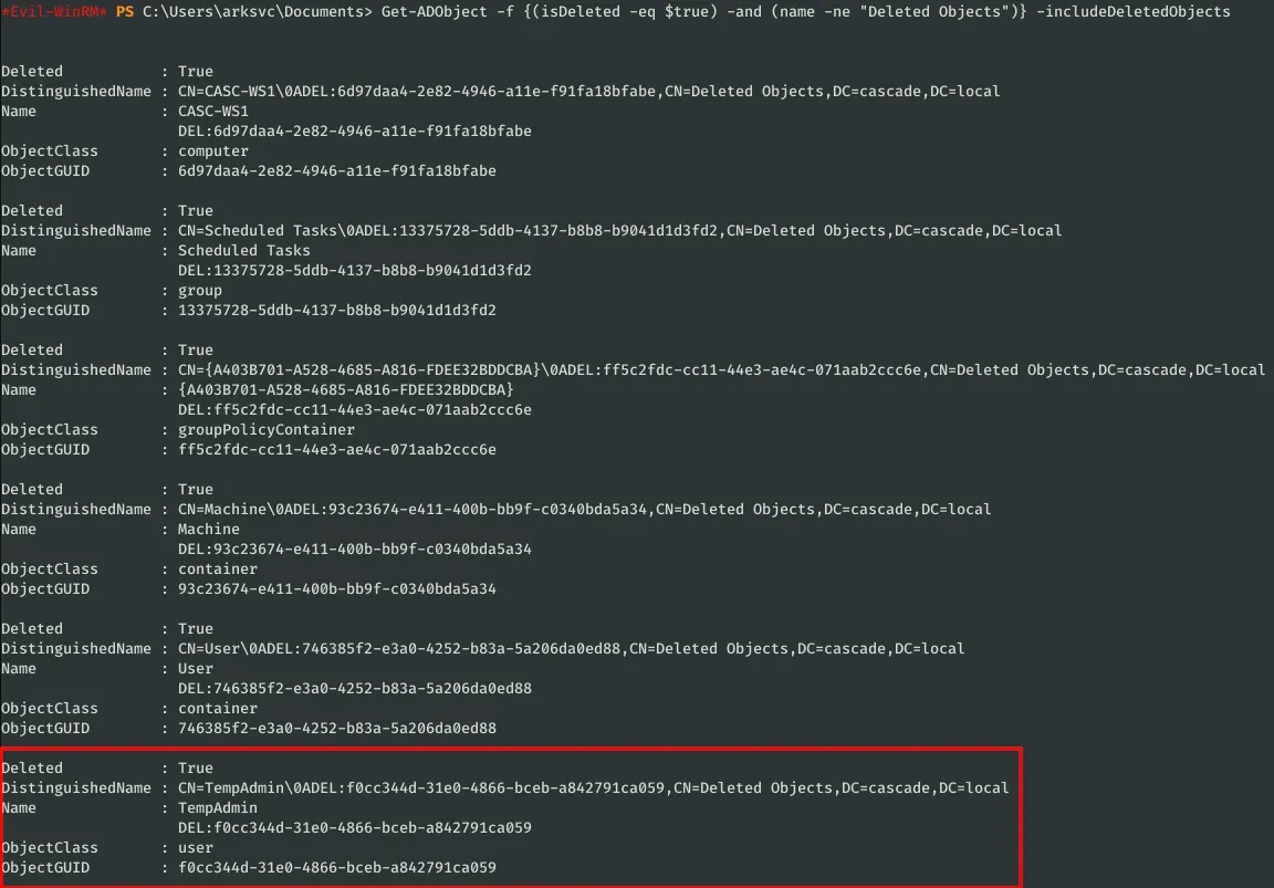 Get-ADObject -Filter {displayName -eq "TempAdmin"} -IncludeDeletedObjects -Properties *