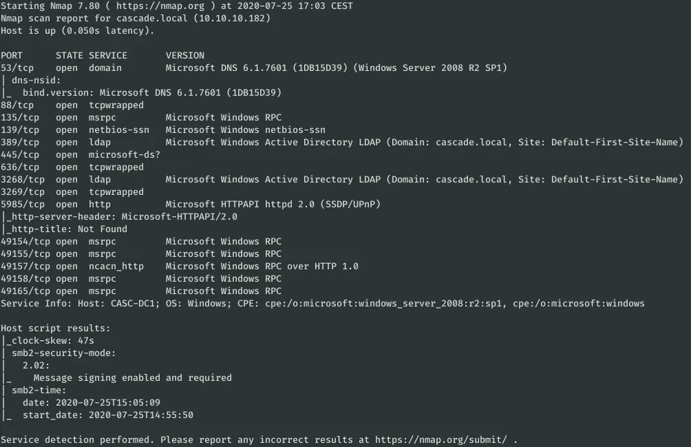 nmap -sC -sV -p 53,88,135,139,389,445,636,3268,3269,5985,49154,49155,49157,49158,49165 --min-rate 4500 --max-rtt-timeout 1500ms 10.10.10.182