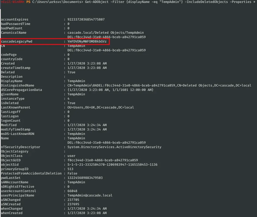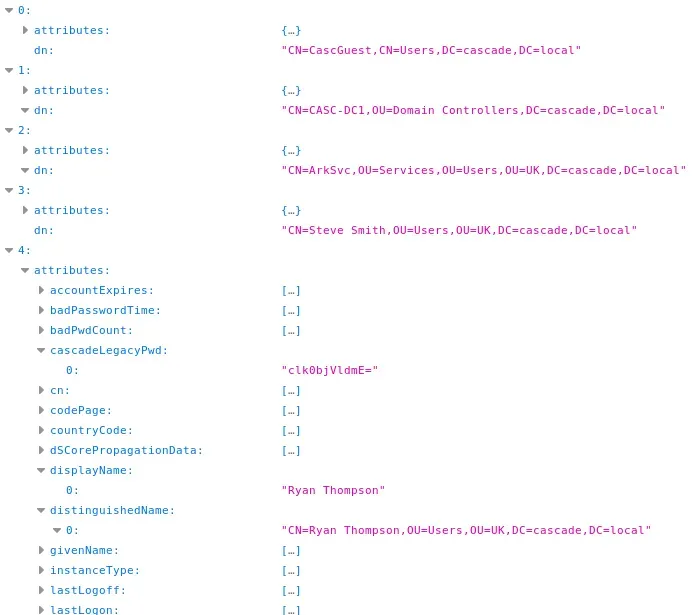 Revisando todos los atributos de cada usuario, encontramos que el usuario “Ryan Thompson” tiene un atributo “cascadeLegacyPwd” que parece ser una cadena de Base64: