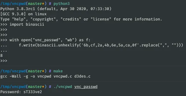 with open("vnc_passwd", "wb") as f: f.write(binascii.unhexlify('6b,cf,2a,4b,6e,5a,ca,0f'.replace(",", "")))