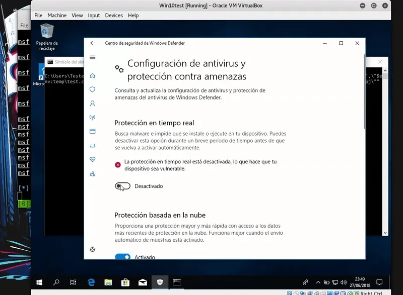 Una vez preparado el ataque ejecutaremos el comando en la víctima y obtendremos un meterpreter. Como podemos ver esta técnica se salta el Windows Defender.