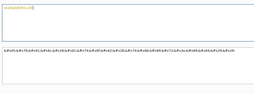 El siguiente problema que se nos plantea es como realizamos la ejecución de un payload complejo como el que realiza las peticiones de exfiltración. No se puede incluir el payload completo debido a que requiere de espacios y eso implicaría utilizar comillas alrededor del evento onerror. Como posible solución, que seguro que hay más, obtamos por utilizar la función eval y la función atob para desahacer base64. De esta manera podemos generar un payload en base64 que guardaremos en otro atributo, y que este sea recuperado, decodificado y ejecutado. La combinación de todo esto la realizamos en los siguientes pasos. Primero generamos el payload en base64
