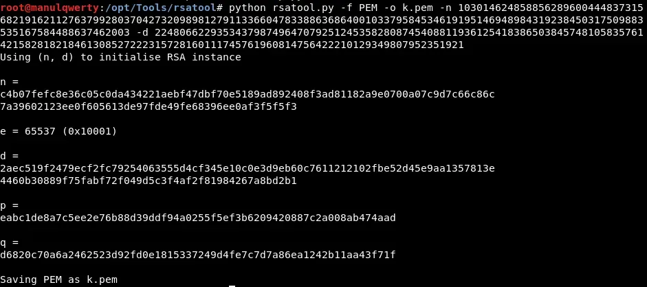 python rsatool.py -f PEM -o k.pem -n 10301462485885628960044483731568219162112763799280370427320989812791133660478338863686400103379584534619195146948984319238450317509883535167584488637462003 -d 2248066229353437987496470792512453582808745408811936125418386503845748105835761421582818218461308527222315728160111745761960814756422210129349807952351921
