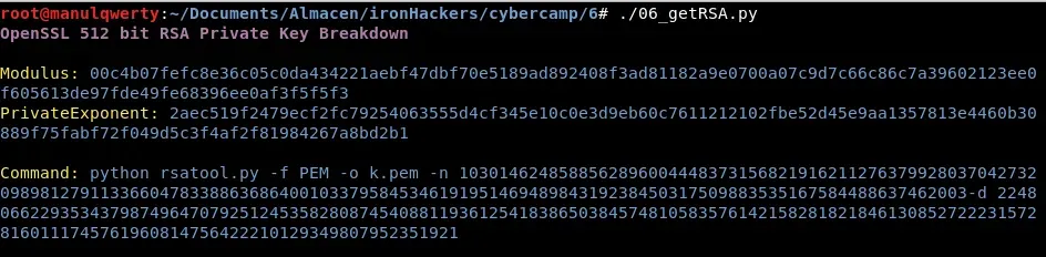 print('Modulus: ' + str(int('00c4b07fefc8e36c05c0da434221aebf47dbf70e5189ad892408f3ad81182a9e0700a07c9d7c66c86c7a39602123ee0f605613de97fde49fe68396ee0af3f5f5f3',16))) print('PrivateExponent: ' + str(int('2aec519f2479ecf2fc79254063555d4cf345e10c0e3d9eb60c7611212102fbe52d45e9aa1357813e4460b30889f75fabf72f049d5c3f4af2f81984267a8bd2b1',16)))Modulus: 10301462485885628960044483731568219162112763799280370427320989812791133660478338863686400103379584534619195146948984319238450317509883535167584488637462003 PrivateExponent: 2248066229353437987496470792512453582808745408811936125418386503845748105835761421582818218461308527222315728160111745761960814756422210129349807952351921 He unido todos estos pasos en un solo script: GitHub - 06_getRSA.py