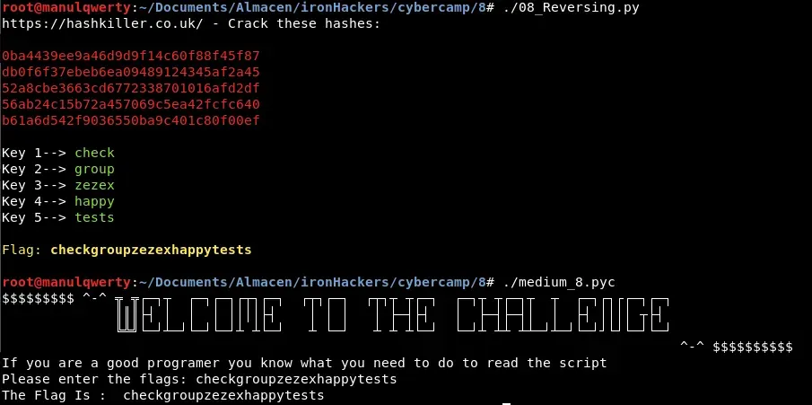 Decompilamos un .pyc de Python 2.7, analizamos la validación por MD5 en bloques de 5 caracteres y reconstruimos la flag crackeando los hashes obtenidos.