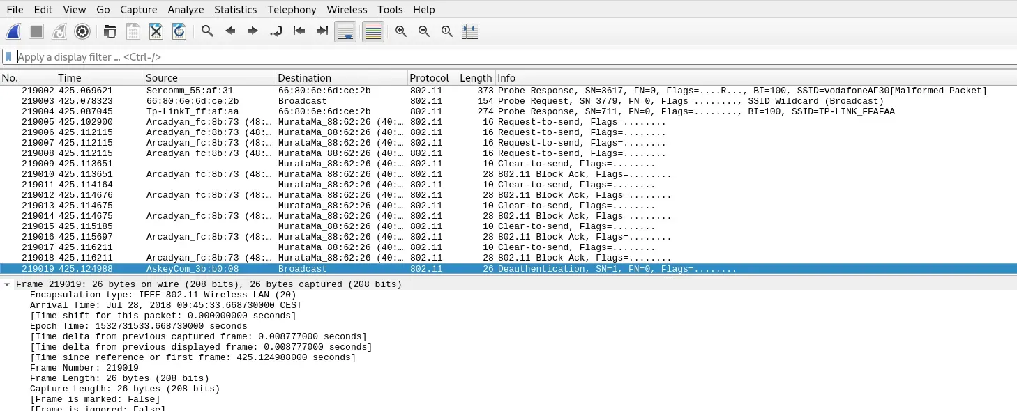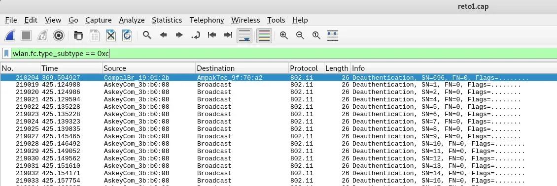Desde hace un tiempo la red Wifi de nuestro cliente no va bien. Se quejan de que a veces no se conectan los equipos y sospechamos que existe algún atacante malicioso en la zona. Hemos enviado a nuestro auditor junior a realizar una captura en el sitio, pero no ha podido determinar lo que pasa y nos ha enviado la captura en formato pcap. ¿Podrías echarle una mano? (Respuesta: flag{dirección MAC en formato XX:XX:XX:XX:XX:XX del host atacado} – ejemplo: flag{xx:xx:xx:xx:xx:xx}) Fichero: reto1.cap