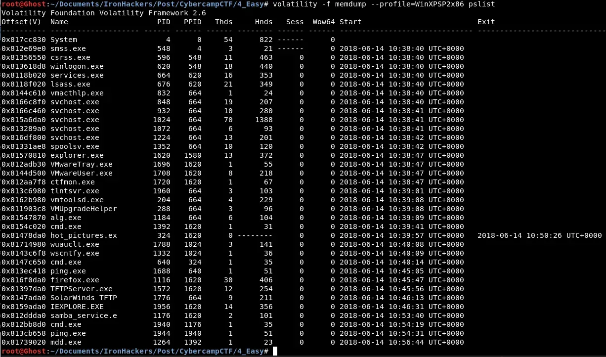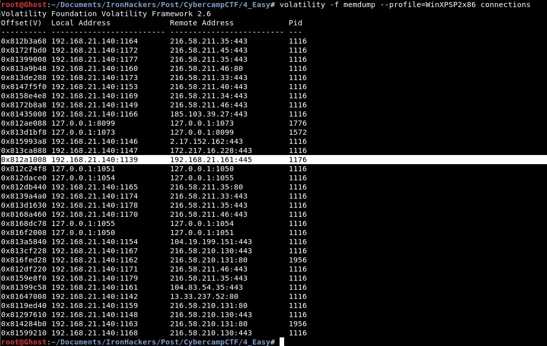 Si analizamos el resultado obtenido en el comando anterior podemos observar algun proceso extraño como un cmd.exe con PID 640 cuyo proceso padre es hot_pictures.exe, en segundo lugar vemos un cmd.exe con PID 1392 pero en este caso el proceso padre es explorer.exe, nada sospechoso. Por ultimo vemos un cmd.exe con PID 1940 cuyo proceso padre es el servicio de SAMBA lo cual es bastante sospechoso. Despues de tener algunos procesos sospechosos podemos descubrir las conexiones que tenia la máquina utilizando Volatility de nuevo.