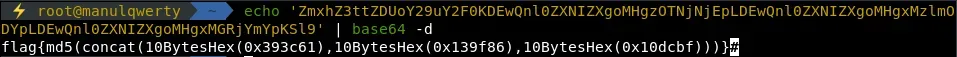 echo 'ZmxhZ3ttZDUoY29uY2F0KDEwQnl0ZXNIZXgoMHgzOTNjNjEpLDEwQnl0ZXNIZXgoMHgxMzlmODYpLDEwQnl0ZXNIZXgoMHgxMGRjYmYpKSl9' | base64 -d