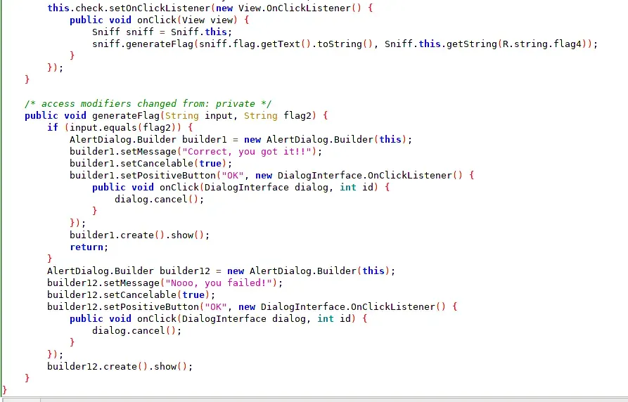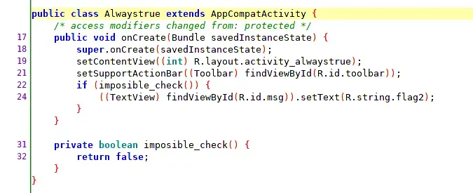 La finalidad de este ejercicio es conseguir saltarse una función que realiza una serie de comprobaciones. Observando el código fuente podemos ver dentro de la actividad Always True que al inicio se llamará a una serie de métodos para obtener la flag. Si accedemos al ejercicio en la propia aplicación veremos que nos devuelve un mensaje de error. Si nos leemos el código de la actividad podemos ver que nunca se llega a mostrar la flag ya que se llama a una función que realizará unas comprobaciones imposibles.