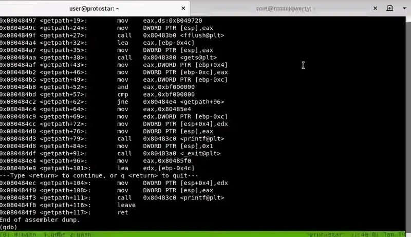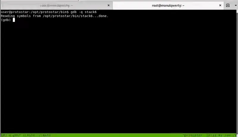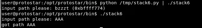 Stack6 looks at what happens when you have restrictions on the return address. This level can be done in a couple of ways, such as finding the duplicate of the payload (objdump -s) will help with this), or ret2libc, or even return orientated programming. It is strongly suggested you experiment with multiple ways of getting your code to execute here. This level is at /opt/protostar/bin/stack6