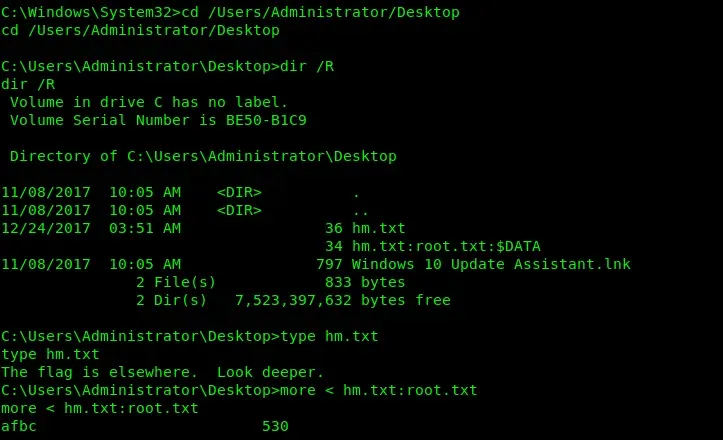 Ya hemos escalado, ahora solo tenemos que leer el root.txt. En este caso nos encontramos con un pequeño reto ya que el ‘root.txt’ está oculto en otro fichero .txt Utilizando dir /R lo vemos fácilmente.