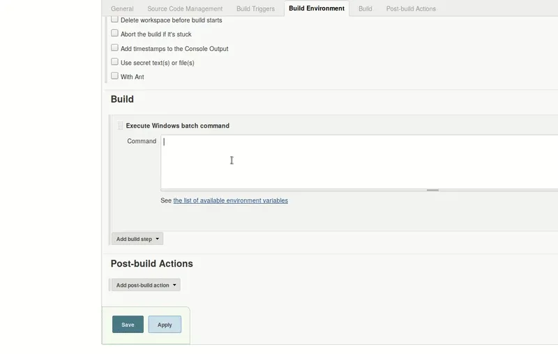 New Item > Freestyle project > Build > Add build step > Execute Windows batch command