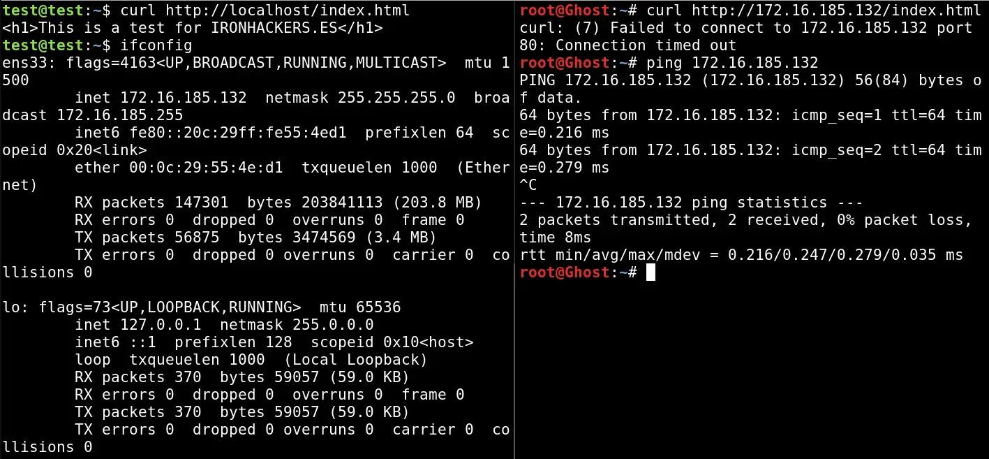 rm -f fifo;mkfifo fifo;nc -v -lk -p 8080 <fifo | nc 172.16.185.132 8080 >fifo El resultado es que tenemos acceso al http de la víctima en localhost:8080 Como hemos visto si hacemos curl http://localhost:8080/index.html