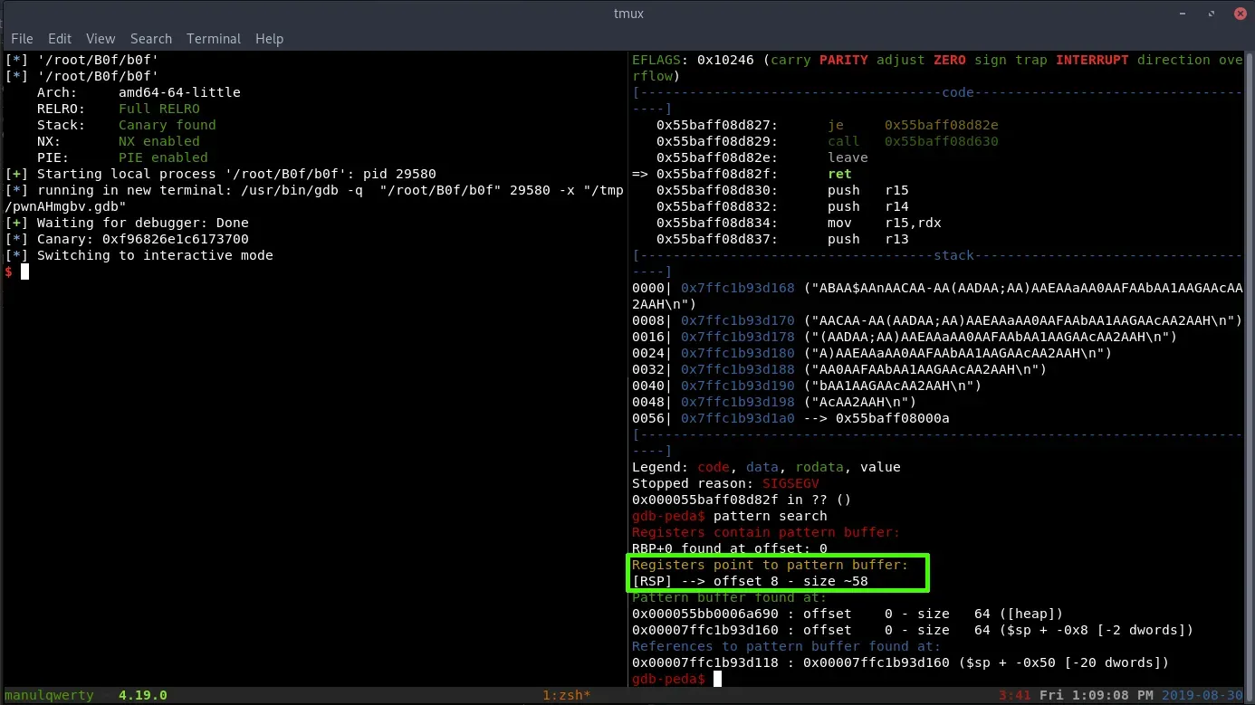 gdb-peda$ pattern create 64 'AAA%AAsAABAA$AAnAACAA-AA(AADAA;AA)AAEAAaAA0AAFAAbAA1AAGAAcAA2AAH' gdb-peda$ r Starting program: /root/B0f/b0f Enter name : A Hello A Enter sentence : AAA%AAsAABAA$AAnAACAA-AA(AADAA;AA)AAEAAaAA0AAFAAbAA1AAGAAcAA2AAH