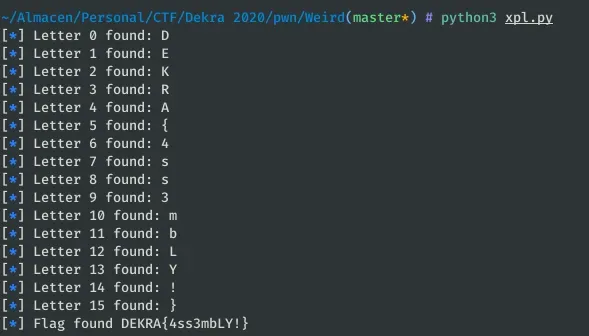 test: mov r12, 'X' start: mov ebx, byte [r13 -0x1] cmp bl, 'D' je test Al entrar en un bucle infinito, desde nuestro script de python podemos detectar que la conexión no se ha cerrado y verificar que la letra coincide. Con este objetivo, desarrollé un script que se ejecutara en bucle aumentando posiciones e iterará sobre todos los posibles caracteres detectando las coincidencias. La manera de aumentar la posición del carácter que se comprueba decidí que fuera obtener la dirección de la flag y sumarle las posiciones necesarias, esto me pareció más cómodo que modificar el operador del código ensamblador.