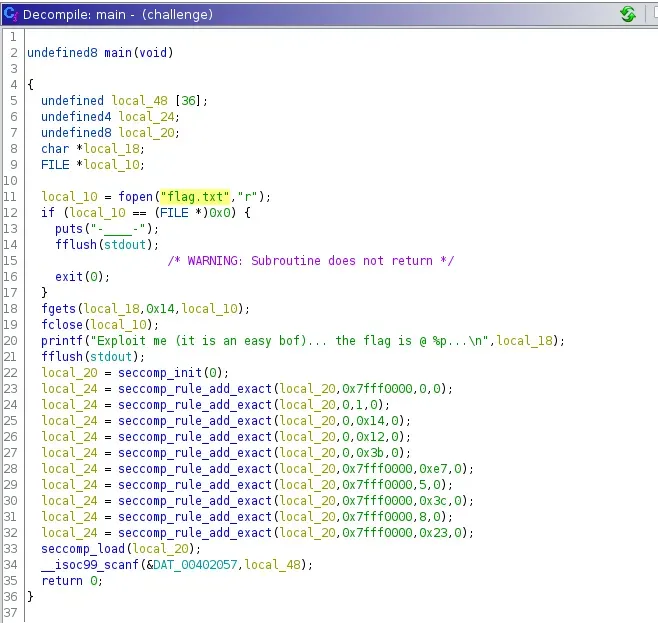 El main parece bastante sencillo. Carga la flag de un archivo de texto llamado flag.txt, comprobando que exista ese archivo, carga el contenido en una variable y posteriormente lo cierra. Después encontramos una serie de llamadas a funciones seccomp que por el momento desconocemos qué hacen. Finalmente lee mediante scanf (sin ninguna limitación de tamaño) la entrada de teclado y la guarda en un buffer definido a 36 bytes, aquí es donde tenemos un posible desbordamiento.