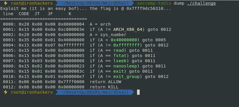 PWN Write-Up: Weird Chall - DEKRA CTF 2020En este post daremos una posible solución al reto Weird Chall planteado en el DEKRA CTF 2020. Es un reto de PWN en el que nos encontramos un buffer overflow, la dificultad de este reto se encuentra en que se utiliza seccomp que nos limita el uso de muchas syscalls. En el enunciado del reto se nos proporciona los datos de conexión con el servicio remoto y el binario para poder analizarlo en local.