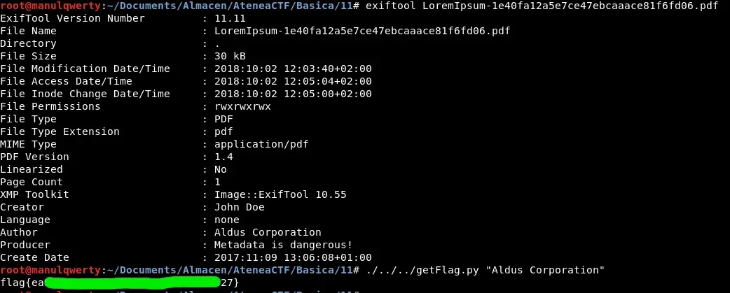 Para ver los metadatos de un fichero podemos utilizar ‘exiftool’, para solucionar este reto bastata con ver el autor: