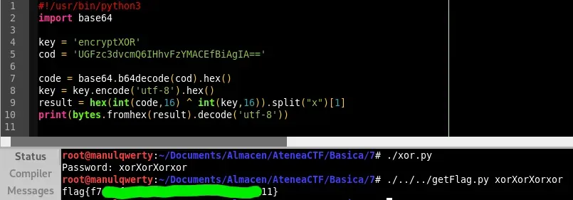 code = base64.b64decode(cod).hex() key = key.encode('utf-8').hex() result = hex(int(code,16) ^ int(key,16)).split("x")[1] print(bytes.fromhex(result).decode('utf-8'))