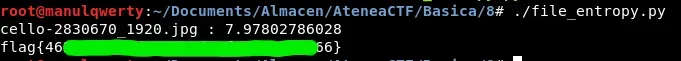 Para resolver este reto podríamos buscarnos un calculador web que nos devolviera el valor de la entropía de cada imagen. Pero con una pequeña búsqueda encontramos un script de python que nos la calcula: https://www.kennethghartman.com/calculate-file-entropy/ Vamos a hacer unas pequeñas modificaciones para que recorra todo el directorio en vez de ir de uno en uno y que ademas nos nuestre solo el de mayor entropía: