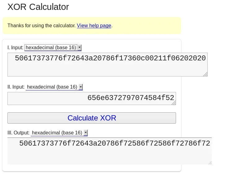 Para solucionar este reto basta con pasar a hexadecimal ambas cadenas y usar cualquier herramienta online que nos permita realizar operaciones bit a bit como XOR