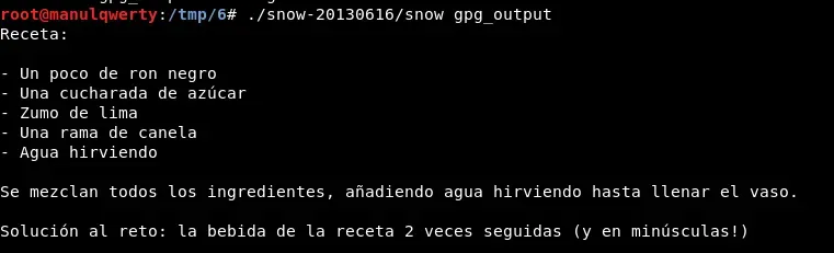 La ejecución de estos comandos nos devuelve un txt, sabiendo que es un reto de stego y tras probar varias tecnicas vemos que con SNOW(http://www.darkside.com.au/snow/) obtenemos la infomacion oculta: ./snow -C gpg_output