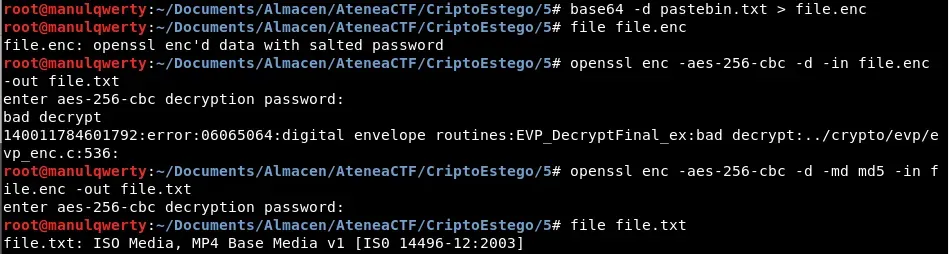 openssl enc -aes-256-cbc -d -in file.enc -out file.txt -k 68913499125FAAVemos que falla, al parecer esto es debido a que en la versión 1.1 de OpenSSL se cambio el ‘digest’ a SHA256 https://stackoverflow.com/questions/39637388/encryption-decryption-doesnt-work-well-between-two-different-openssl-versions