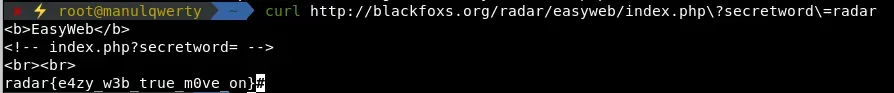 Resolución En el código fuente de http://blackfoxs.org/radar/easyweb vemos: . Tras varias pruebas obtenemos el flag en http://blackfoxs.org/radar/easyweb/index.php?secretword=radar