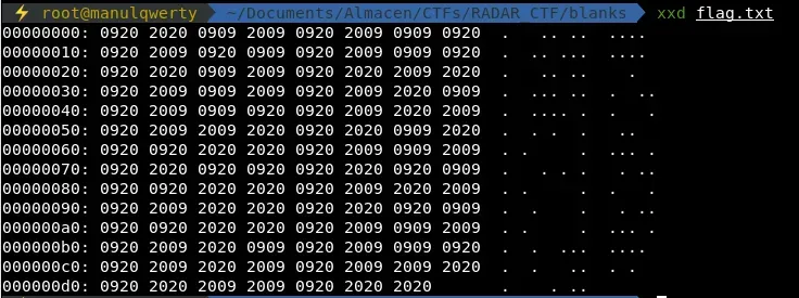 f = open('flag.txt', 'rb') hex_flag = f.read().encode('hex') binary = hex_flag.replace('09', '0').replace('20', '1')