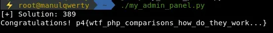 0006464640640064000646464640006400640640646400 ord(i) & 0xC0 == 0 → si i es un número ord(i) & 0xC0 == 64 → si i es una letra Así que sabemos que los 3 primeros caracteres del MD5 correcto son números; el fallo del código está en que hace una comparación “loose” (https://www.owasp.org/images/6/6b/PHPMagicTricks-TypeJuggling.pdf) Así que con adivinar los 3 primeros caracteres del MD5 podremos resolver el reto, vamos a crear un pequeño fichero en python: