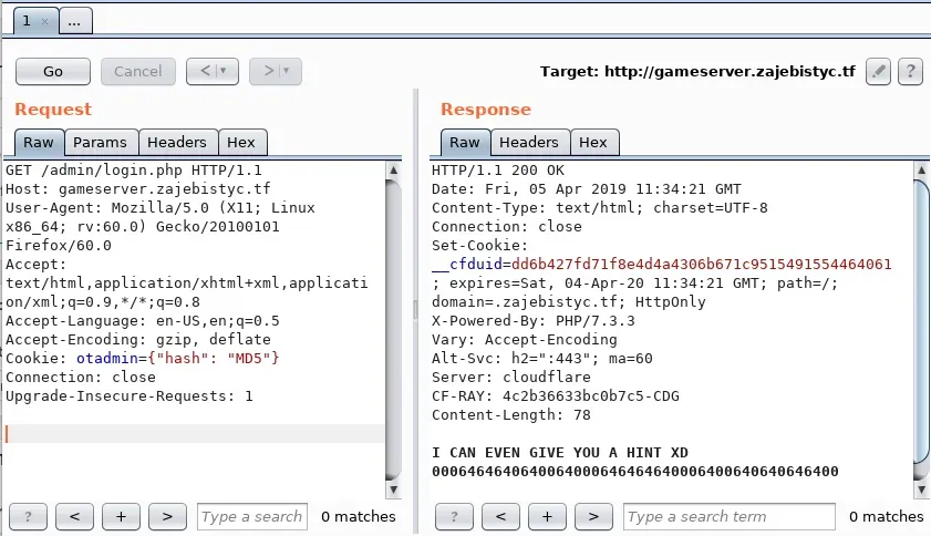 if (!$_COOKIE['otadmin']) { exit("Not authenticated.\\n"); } if (!preg_match('/^{"hash": [0-9A-Z\"]+}$/', $_COOKIE['otadmin'])) { echo "COOKIE TAMPERING xD IM A SECURITY EXPERT\\n"; exit(); } $session_data = json_decode($_COOKIE['otadmin'], true); if ($session_data === NULL) { echo "COOKIE TAMPERING xD IM A SECURITY EXPERT\\n"; exit(); } if ($session_data['hash'] != strtoupper(MD5($cfg_pass))) { echo("I CAN EVEN GIVE YOU A HINT XD \\n"); for ($i = 0; i < strlen(MD5('xDdddddd')); i++) { echo(ord(MD5($cfg_pass)[$i]) & 0xC0); } exit("\\n"); } display_admin(); ?> Vamos a interceptar la petición con Burp Suite para hacer más sencillo el proceso de obtener la pista (linea 17). Debemos crear una cookie ‘otadmin’ con el formato otadmin={“hash”: “MD5”}