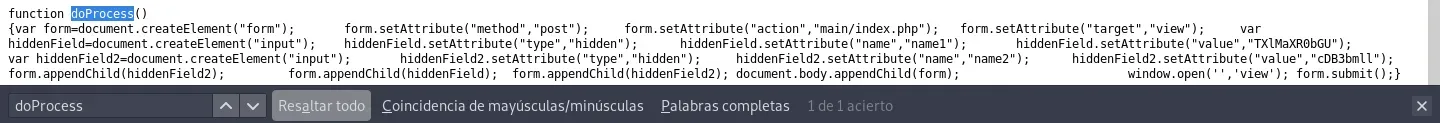 function doProcess() { var form = document.createElement("form"); form.setAttribute("method", "post"); form.setAttribute("action", "main/index.php"); form.setAttribute("target", "view"); var hiddenField = document.createElement("input"); hiddenField.setAttribute("type", "hidden"); hiddenField.setAttribute("name", "name1"); hiddenField.setAttribute("value", "TXlMaXR0bGU"); var hiddenField2 = document.createElement("input"); hiddenField2.setAttribute("type", "hidden"); hiddenField2.setAttribute("name", "name2"); hiddenField2.setAttribute("value", "cDB3bmll"); form.appendChild(hiddenField2); form.appendChild(hiddenField); form.appendChild(hiddenField2); document.body.appendChild(form); window.open('', 'view'); form.submit(); } En la función hay unas credenciales: TXlMaXR0bGU:cDB3bmll con las que accedemos a la plataforma.