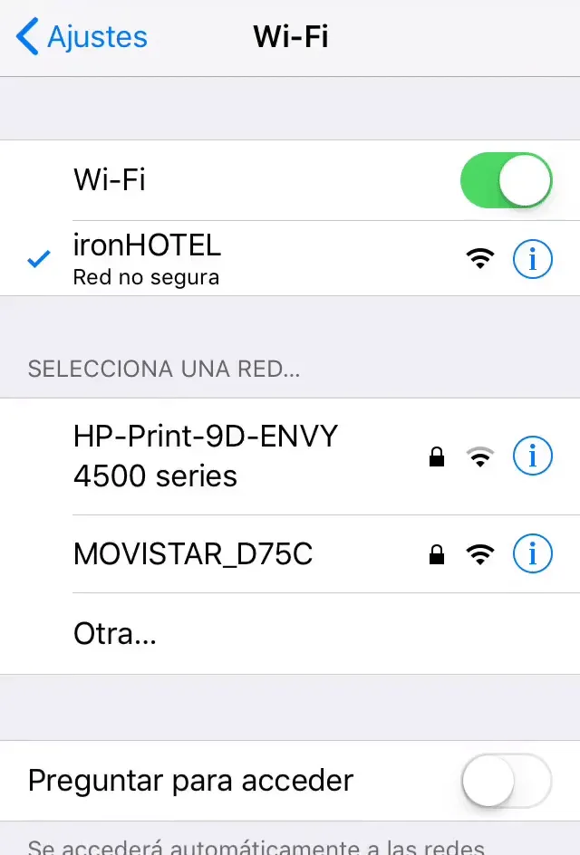 Now if we access to Wifi configuration in our phone we will see that our connection to ironHOTEL suddenly disconnect. Right now our secondary network interface will be sending de-authentication packets. It will take a few moments but we see how the device automatically connects to our fake access point.