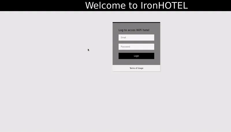 The first step in this attack will be to obtain information about the WIFI of the victim, so we will connect to our victim access point(ironHOTEL) and we will see a login page that opens automatically to allow us to navigate.